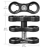 Specification: Length: 2.48 inch/6.3 cm; Ball size: 1 inch/25 mm; Weight: 9.6 oz/272 g. The ball clamp is used to attach 2 arms, base adapters and strobes together, the 1" ball clamp mount compatible with most of the arm and camera Material: The underwater diving light arm is made of high-quality hard anodized anti-wear surface treatment, made by aluminum alloy, lightweight, durable, can rotate 360°, multi-position free connection and fixation, more freedom to adjust the flash direction Design: Can connect multiple diving equipment; Naturally suitable for fingers, made of aluminium alloy to enhance its maneuverability, has low power consumption, is not easy to loosen, adjusts the relative angle of the articulated arms to firmly clamp the ball joint Usage: Finding the buoyancy for your underwater camera through the standard ball clamp; Standard clamp attaches 1'' ball to ball arms; Perfectly connect the ball head with the fill light, flashlight, arms, floats or action camera when normal shooting and underwater photography Versatile: Standard 1" underwater balls clamps are compatible with arm brands like Seafrogs, CamDive, Meikon, Ikelite, TLC, Ultralight, Nauticam, and more; Wide range of utility, a great choice for photography enthusiasts