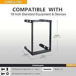 SIZE: Width: 19.7”, Depth 17.7”, with Height 30.3" (15U), also other option 4U, 6U, 9U, 12U, 18U are available. STURDY: Heavy-duty, SPCC cold-rolled steel open frame construction can safely support up to 180 lbs. (80 kg)rack mount equipment. The black RAL9005 powder coat finish makes this 15U rack resistant to scratching and rusting, Matte black is usually a safe choice for recording studio, gaming room, Hifi room, home theater, conference room, garage room, study room, weak current room & communication room. VERSATILE: With 80 kg load capacity, this versatile wall rack series is ideal for electronics & equipment gear like AV, TV, NAS, DATA, server, internet router, amplifier, hard recorder, computer, and video game console like PS5 X-box. INSTALLATION: Easy assembly according to instruction. Comes in one box with safely packed rack parts and relevant accessories of M6 screws cage nuts and bolts. APPLICATIONS: This RIVECO network rack series is compatible with EIA-standard. Side cage nuts holes installation distance is 470 mm, ideal for installing patch panels and other network equipment in secure with M6 screws. Make sure your devices are no longer than 17.5”.