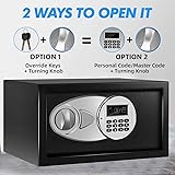 [Latest Sensor Light Design] : This money safe is equipped with an internal sensor light. When you use the numeric keypad to open the safe, the sensor light will light up immediately. So you can see the internal valuables clearly. When you close the door, the sensor light will go out. In addition, there is a LED display screen equipped with low battery light, warning light and confirm light too, making the appearance be more upscale, and giving the clear indications for you. [2 Ways to Unlock] : One is the manual key + knob. (When you use the safe for the first time, you can only remove the lock cover and open the safe with the key. Remember to keep the key in a safe place outside the safe and do not lock it in the box). The other is the personal password/master password + knob. Please press the reset button which is behind the door.And you will hear 2 beeps. Now you can input your own code(3-8digits) on the keypad. Then press the # button to confirm. [Size and Capacity] : The outer size of the wall safe: 12.2" x 7.87" x 7", the inner size of the home safe: 11.7" x 7.37" x 6.5". Capacity: 0.4 cubic feet. [ Humanized Design] : The safe box is made of solid steel with coating, having strong reliability and long-lasting strength; designed an External Power Supply for you. If your internal batteries have been dead and you lost the key too, you can connect the power to the safe by the external battery connection hole. Then you can input the code to unlock your personal safe. And it is equipped with a soft carpet as a protective layer to prevent scratching or damage to internal items. [Safe & Concealed Design] : This digital safe has two thickened movable door bolts, a pry-resistant steel door and a hidden tamper-proof hinge, allowing you to store items more safely. If an incorrect code is entered 3 times, the safe will lock for 30 seconds. Three additional incorrect entries will lock the safe for 5 minutes. And you can use two expansion bolts to install it on the wall, or hide it in a ledge or cabinet. It applies to your home, offices, hotels, restaurants or banks.