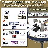 BEST FOR DEEP CYCLE batteries in your mobile medical equipment (wheelchair or ride-on scooter), RV or other craft / equipment. VOLTAGE SELECTION - 12V or 24V (2x12V in series) charge mode to match your lead-acid battery voltage. FINE TUNE CHARGE LEVEL to match your deep cycle battery - 3x charge levels each for 12V & 24V that matches recommendations for flooded, sealed AGM or lead-calcium batteries. SAFE SELECTION - won't automatically start charging if battery voltage does not match selected charge mode (e.g. won't charge a 12V battery if 24V mode is selected; for a dead flat 24V battery it needs you to confirm selection before proceeding). FULLY AUTOMATIC once you've made the selection, plus your selection remains in memory even if the charger is disconnected from AC supply. TEMPERATURE COMPENSATION guarantees your battery will never be over or under-charged - Voltage automatically adjusted higher when colder, lower when hotter. 24-7 SAFE LONG TERM CONNECTION - will keep your battery at precisely the right charge for months! CHARGE SMALL OR LARGE BATTERIES - Ampmatic charge control automatically adjusts charge rate to match battery size - smaller battery gets less amps, larger battery gets more. IF YOU FORGOT TO CHARGE - Saves 'dead' / sulfated batteries other chargers can't, from as low as 0.5 Volts.