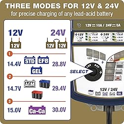 - The ideal battery charger for your 12V or 24V lead-acid batteries. Capable of charging Deep cycle, SLI, STD, GEL, Ca-Ca, Spiral cell and AGM batteries from 10Ah to 240Ah. Selectable voltage for 12V and 24V with voltage protection. Can be used as a charger for light aircrafts, aviation, agriculture, tractors, RV, golf carts, vintage cars, modern vehicles, trucks, boats, jet skis, medical vehicles and many more vehicles. Ampmatic charge control allows charge to small and large batteries safely. SMART charger with 24-7 SAFE maintainence program, plus SAVES dead battery from as low as 0.5V.