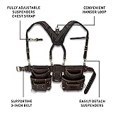 Comfortable - The Ultimate OX Tools leather padded suspenders boast a padded support is made from heavy-duty nylon with foam support for added comfort while on the job. Heavy Duty - The framing tool belt, pouches, and suspenders are all reinforced with heavy duty rivets at common stress points to reduce common wear and tear that comes with working on a jobsite. Ergonomic - A 3 Inch tool belt brings all the pieces together, adding support and comfort, increasing the ergonomics of the rig making it easier for you to wear for longer periods of time. Quality Materials - The OX four piece tool rig is crafted from strong, high-quality, oil tanned leather to withstand any challenge while keeping a soft look and feel. Adjustable - A fully adjustable chest strap and leather loops help to secure attachments to your tool belt, making carrying bolsas para framing and tools effortless.