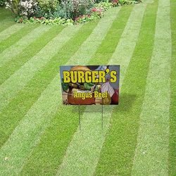 - Weatherproof Outdoor for Sale Yard Sign Share your ideas, opinion, beliefs & advertisement in your neighborhood with our yard garage sale sign. Our street sign provides the most economical form of advertising and can be displayed along roadsides, in front of stores or in gardens. It can also be easily mounted anywhere without the stand with zip ties, screws or nails (not included). The text reads burger's angus beef. Perfect as: angus burger yard sign, burger sign for yard, fast food signs spring, ground meat signs with stake, or cooked patties corrugated plactic sign. We print with high quality inks with vivid colors making sure your advertisement sign is being seen! Our designs are professionally printed with state-of-the-art equipment guaranteed to last for years. Our prints on for sale by owner yard sign will continue to look great after many years. We have more than 12 years of experience in the printing industry to offer you stunning detail and rich lifelike colors. BEST YARD SIGN ON THE MARKET! ** Made from high quality corrugated plastic sheets ** Perfect for outdoor ** Treated against UV & water to last for years ** Stand included for an easy ground installation ** Design professionally printed with bright colors Whether you are a business owner or a homeowner, you will be 100% satisfied with our yard signs.