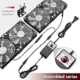 Ventilation Fan: Designed to quietly ASUS GT/RT- AC5300 , cool Xboxs, CPU/ GPU, Playtations, Rokus, TVs, receivers, mondems, routers, DVRs, window fans ,network appliances, DIY aquarium cooling and other audio video electronics Variable Speed Control: 110V - 220V Fan power supply with speed control function, turn the knob to adjust the speed, 4V - 12V adjustable fan speed,and can turn off the fan . | Input: 100V - 240V 50/60Hz | Output: DC 3-12V 200-2000ma DIY Vertical Window Fan: Can both vertical and horizontal, provide efficient cooling and ventilation. Mining rigs rely on the cooling power of fans for optimal operation.Double Metal Protective, the fan is equipped with double metal protective net Easy to Install: Draw out air in refrigerators, provide ventilation in greenhouses, prevent amplifier overheating, and vent hot air from living room consoles like PS4. Y cable connects 2 fans, two fans can be 42cm/16.5 in far away from each other Dual Ball Bearing: 240mm x 240mm x 25mm / 9.45in(L) x 4.72in(W) x 1in(H) in in total. | Rated Voltage :12V | Rated Current: 0.93A at full speed | Airflow: (82CFM)x4 at 12V | Speed: 2500 RPMx4