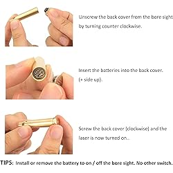 - Specification: Color: Red Battery type: LR41(Batteries included) How to use the bore sight? 1.Unscrew the back cap from the bore sight by turning counter clockwise 2.Stand the bore sight on a flat surface with the laser side pointing down 3.Insert batteries (+ side up) inside the rear opening 4.Carefully push down and turn the screw cap clockwise to tighten the cap (the laser is now on) 5.Place in your rifle’s chamber and close the bolt 6.To remove - open the bolt if it does not automatically extract, manually remove the unit by tilting the rifle’s barrel upward (always practicing safe firearm practices) 7.Unscrew the back and remove the batteries to turn the unit off Package included -- 1 X 45 ACP Bore Sight -- 4 X LR41 Batteries