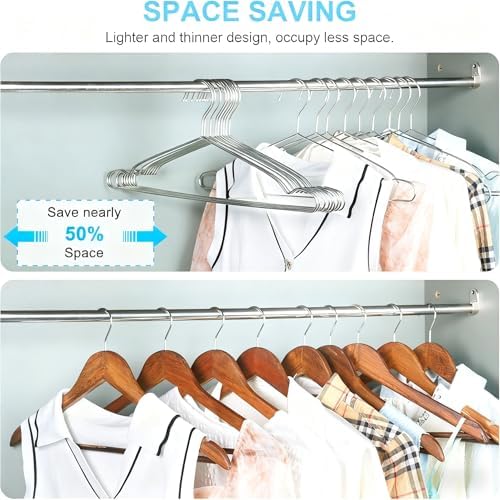 - SPACE SAVING HANGERS: The ultra slim heavy duty hangers with a thickness gauge of 0.12 inches allow you to make full use of the limited space of your wardrobe. Compared with other ordinary clothes hangers, these ultra-thin hangers takes up nearly 50% less space.