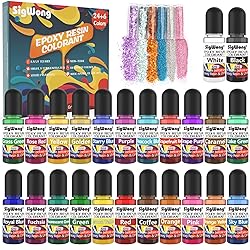 - This liquid color pigment is very easy to mix with epoxy resin. It works great for coloring epoxy resin craft, resin jewelry DIY making, etc. You just use a little drop then can go a long way. It is great designed for all your creative projects. SigWong Resin Colorant Set includes: 24 colors translucent epoxy resin pigment (6ml each) 2 different kinds of resin glitters (each kind has 3 colors) 2 different glitters satisfy your different needs. The combination of resin dye and shiny glitters will add more interest to your artworks. Perfect suitable to use in the making of resin jewelry, resin coasters, resin alphabet, resin ornaments, resin pour arts and other DIY resin projects. Come and make pretty resin crafts with this epoxy colorant set!