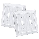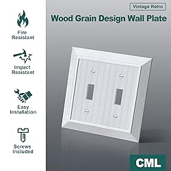 CML Classic Double Toggle Light Switch Wall Plate, 2-Gang Outlet Covers, Vintage Retro Wood Grain Design, Standard Size 4.95”X 4.87”, Impact Resistant, 2-Pack, White