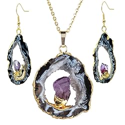 Reiki Jewelry Set for Women: 1pc Irregualr shape Agate Quartz Geode Druzy pendant necklace, comes with 22'' chain, 1 pair of Irregualr shape Agate Quartz Geode Druzy crystal dangle earrings. Each pendant and each pair of earrings is well packed in our gift pouch. Healing Crystal Stone: The Agate can't change emotions, but helps to change our level of acceptance of the emotion. For instance when you are in grief the agate will let you know that this will pass and help you get on to another brand new day. Chakra: Crown Chakra(Amethyst); Birthstone: February(Amethyst). Agate Quartz Geode Druzy: The color of agate geode graduated from light to dark, they may have brown, tan, grey, black and earthy colors. Shapes of crystal are irregular, raw or slices. Unique Jewelry Set: Natural Agate Geode Druzy, irregular, raw slice, amethyst crystal stone in middle. Totally handmade jewelry, crystals are natural and vary in sizes, shapes, colors. You will received unique ones similar as pictured. Unique style, fit any occasions, both everyone. A perfect gift for jewelry collection, birthstone collection, Valentine's Day, Christmas, New Year, Birthday, Mother's Day and more.