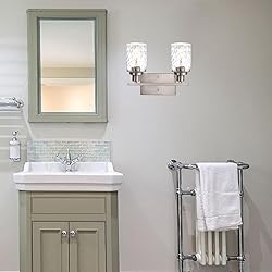 Eye-catching Design: This wall light ideal for striking a balance between strength and elegant beauty. Encased in attractive water ripple glass shade could output for an elegant soft light ambience. The wall mount light design allows for this sconce to be installed in an upwards or downwards position Application: Stunning clear hammered glass shades create a soft illumination light to your home. This vanity light is ideal for any style decoration for your bathroom mirror, bedroom, powder room, hallway and other interior places you like Bulb Type: Support any LED/CFL/or other max 60W bulbs with E26 Base for this vanity light(Bulbs NOT Included), Could be fully dimmable when used with dimmable bulbs and compatible dimmer switch Dimensions: Bathroom Light: 9.8" (H) x 12.2" (L), Back plate: 4.72" (H) x 7.9" (L), Clear Glass Shade: 5.1" (H) x 4" (Opening) ; The bathroom lights design allows for this sconce to be installed in an upwards or downwards position Easy to Assemble: All mounting hardware required for installation are included in the package. Just need to follow the illustrated instructions provided for assembly and installation