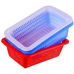 MATERIAL - Made of plastic, the bottom is thickened to ensure good bearing capacity, and the design has four anti-skid raised feet, which are also easy to drain when washing fruits and vegetables. 24 PACK - This rich bulk pack comes in bright assorted 3 colors. You can get 8 each of white, red and blue. Measuring 9.05 x 6.29 x 2.75 inches / 23 x 16 x 7cm (LxWxH) EASY TO TRANSPORT - The edges of plastic storage baskets are smooth and burr-free, and the two sides are designed with protruding ears, which provide you with a more stable and labor-saving transportation and movement, and can be stacked for easy transportation or storage. WIDE RANGE OF USE - Put bright color plastic bins on any countertop or shelf or stuff them into closets, cabinets, drawers to keep your work and life in order, clean and tidy, and bid farewell to chaos.