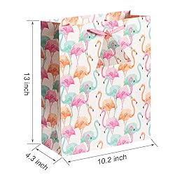 - Measures 12.6 Tall x 10.4 Wide x 4.3 Deep . Made of 210 grams of white cardboard and can support up to 12 pounds. Perfect for holding books, clothing, home accessories or a collection of smaller items. Elegant gift bag features a Flamingo design. a gift tag, satin ribbon handles, and include 3 sheets of tissue paper . This Large gift bags is perfect for birthday treat bags, bridal shower, holiday celebration, the goodie bag, party bag, party favor bag, wedding bag, retail bag and more. It is made of wood pulp, beautiful design, durable and reusable.