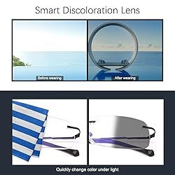 - What You Get From Photochromic Blue Light Blocking Rimless Bifocal Reading Glasses?Save Cost - Because this is a multi-functional glasses that integrates bifocal reading glasses, photochromic color change sunglasses and blue light blocking computer glasses. Photochromic glasses have lenses that change tint depending on the weather or surroundings.But in bright, sunny conditions they will go dark. Double light Glasses,Read a medicine label, do a crossword, watch TV, and see in the distance all with one pair of readers. No more switching glasses for different activities.Clear glasses with UV400 Photochromic lenses shift from reading glasses indoor to reading sunglasses outdoor. Whether you are reading, using computer or looking at a distance. Blue light filter glasses will protect your eyes from the harmful blue light. No dry eyes during long time working with electronic screens.You don't need to spend extra money to get reading glasses, sunglasses and blue light blocking glasses. Our reading glasses with multifuctional,so no longer will you need to carry multiple pairs of glasses.A pair of glasses to solve all your needs! Photochromic technology darkens the lens automatically to help you adapt to changing light and blocks UV.Distortion Free Lenses - Keep text sharp, even in your peripheral vision.Usage Multiple Occasions - Photochromic reading sun readers can do a good job of stopping the dazzling effects of sunlight when you are driving, running, fishing, biking or reading indoor or outdoor activities. Keep your safety always by your side.Package list:1 x Photochromic Blue Light Blocking Rimless Bifocal Reading Glasses 1 x Eyeglasses cleaning cloth1x Sunglasses case