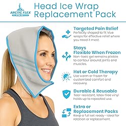 - Replacement Full Head Ice Wrap Cold Pack Perfectly sized, the replacement ice wrap cold packs are designed for use with the Vive full head ice wrap. The cold packs are filled with a unique non-toxic gel that remains flexible when frozen for targeted relief and can be warmed to reduce inflammation. Constructed with soft, yet durable vinyl, the cold packs are latex-free and safe for sensitive skin. Large Full Head Ice Packs: Sized to perfectly fit in the Vive full head ice wrap, the replacement ice wrap packs are easily secured in the interior mesh pockets of the wrap for targeted relief. The unique shape also includes sealed dividers to ensure the soothing gel remains evenly dispersed throughout the packs. Flexible When Frozen: Soft and pliable, the Arctic Flex gel cold packs are filled with a non-toxic silica gel that remains flexible when frozen to contour to the wrist for effective pain relief. Use for Heat or Ice Therapy: Providing soothing cold or heat therapy, the Arctic Flex gel packs can be cooled or warmed for a personalized experience. Store the cold pack in the freezer for two hours or more for pain-relieving cold therapy. The gel pack can also be heated in a microwave or a similar manner for effective heat therapy. Durable and Reusable: Soft, yet durable, the Arctic Flex gel ice packs are constructed with a strong, latex-free vinyl that is tear and split resistant and safe for sensitive skin. What’s Included: Arctic Flex Replacement Full Head Ice Wrap Packs