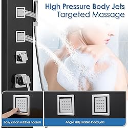 5-Function Shower Panel: Luxury shower panel features built-in LED temperature display, LED lights rainfall waterfall shower, adjustable body jets, tub spout, and 3-setting handheld shower wand, all in one shower column Shower Panel with Led Lights: This shower panel has water powered blue LED lights (no battery needed). They shine subtle blue lights from above to create a romantic, soothing space for bathing Digital Temp Display: Fahrenheit temperature display shows water temperature and shower time, it makes water temperature visible and shows you how long you have showered for. Display readout is powered by water, so you don't need to continually replace the batteries Solid Shower Panel: Constructed of 304 stainless steel to be durable and corrosion resistant, copper valve and diverter with ceramic cartridge ensuring dependability and longevity; Replacement or refund for quality issue Easy to Install and Use: Pre-plumbed with standard NPT 1/2 in. connection and reinforced pipes in the rear, can be easily installed on flat walls. Rotate the shower diverter knob handle to switch shower modes (only 1 shower mode at a time), single lever handle control water temperature and volume