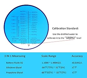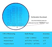 - This portable Battery Fluids/Antifreeze Coolant refractometer is used for testing automobile freezing point & concentration of either ethylene or propylene glycol based cooling systems & testing ethylene or propylene glycol based anti-freezing liquids and can also be used for checking the specific gravity of battery fluid. Refractometer Features: Antifreeze refracotmeter provides tri-scel for easily reading in Fahrennheit (℉), no need to change units and save your time Automatic temperature compensation (ATC) antifreeze tester eliminate the deviation by temp changes ensure to get accurate readings Refractometer features high quality optics with Ultra-smooth foucsing- see the scle more clearly Antifreeze hydrometer is made of highest and finest quality of aluminium and non-slip ABS rubber, anti-rust and stain-resistant Just put 2-3 drops of solutions on testing prism, you can get the accurate results through the eyepiece Multi-fucntional Refractometer: With this antifreeze refractometer cloolant tester, you can: Check battery charge condition and it’s health condition Testing freezing point of your car cooling system Knowing the status of your car coolant Ensure all are working properly and not causing problems like rust, prone to freezing, poor charging, poor cooling, etc Specifications: Measuring Range: -84℉ ~ 32℉ (70%-0%) Ethylene Glycol -60℉ ~ 32℉ (63%~0%) Propylene Glycol 1.10 ~ 1.40kg/l Battery Fluids SG Division: 5℉ Ethylene Glycol 5℉ Propylene Glycol 0.01kg/l Battery Fluids SG Accuracy: ±5℉ Ethylene Glycol ±5℉ Propylene Glycol ±0.01kg/l Battery Fluids SG ATC: 10-30°C Item Lenght : 5.98” Item weight: 3.2oz Shipping weight: 9.17oz Package Includes: 1 x Antifreeze Refractometer 1 x Mini screwdriver 1 x Carrying box 1 x English Manual 1 x Pipette
