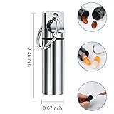 - Features: 【Portable but surprisingly capable】 This pocket pill box keychain set is the only 0.5 oz(15g). Each individual pill lanyard is equipped with a key ring at the top, we can easily fix them on the handbag or belt through the key rin when we go out, it will be a good assistant for you to travel 【Super waterproof】 The pill holder has a rubber O-ring gasket on the screw cap made it airtight and watertight enough to keeps your pills inside safe and dry when you are on vacation, trip, camping or any outdoor activity.This small pill holder is made of good aluminum alloy instead of plastic, which fully protects the pills inside. 【Unique design】 The unique shape of the top of the small pill container allows you to open the lid and get what you want in a short time, saving you more time. 【More possibilities】 This pill box for purse can be used not only for small pills, but also for storage of other items.Such as earplugs, toothpicks, spices, etc.lets you use them for different purposes.Create more possibilities for your life. Package include: 1 X Pocket Pill Box Keychain (Silver) Specification: Material: Aluminum alloy + Rubber O-ring External dimensions: 2.36” x 0.67”/60 x 17 mm(Height * Bottom diameter) Weight: 0.5 oz(15g)(Approximately)