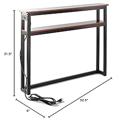 Slim console table is great way to add a surface behind your couch and easy access to a plug for your tablet or phone. It has a tabletop for easy access to snacks, and a shelf underneath to display photos and small objects. This sofa table is a great addition to your living room. Its transitional style will go with any décor. It has two power outlets and two USB ports. The table plugs into the wall with an attached extension cord. Keep this electrical plug accent table for your own home or give it as a gift to family and friends who like to add a modern accent that is powered to their interior décor. MDF and metal. Assembly required; assembly hardware included. 52-1/2”W x 6”D x 31-1/2”H Behind-the-Sofa Long and Narrow Console Table with USB Port and Outlet