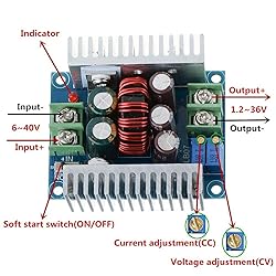 - Maintain stable output voltage and limit the output current over a range of input voltages. Great for general voltage conversion, battery charging, powering raw LEDs, automotive electronics, battery conversions, micro-controllers, and electronic projects. Input Voltage: 6-40V DC • Output Voltage: 1.25-36V DC • Max Load: 300W/20A Peak, 15A Sustained Minimum Dropout: 3V • Conversion Efficiency: Up to 96% • Short-circuit protection • Non-isolated Dimensions: 60x53x27mm • LM25116 IC • 150KHz Switching Frequency • 50mV ripple Input must be at least 3V more than the output voltage. Applying reverse polarity voltage to the input or output may damage the module. A fan is required if the module temperature exceeds 65°C