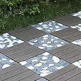 Natural Sliced Pebble Stones: The best of pebble natural stones, collected from river/ocean, carefully sliced on the front and the back to create a flat surface while maintaining the natural curved outline of each individual pebble, and then glued to a strong interlocking plastic base; Resists fading for long-lasting beauty. (Pebbles are all natural, so it may come with a wide variety of natural shapes and a beautiful blend of different shades of black, grey and white.) Water Resistant: The underside of the deck tiles has an open grid design that allows water to drain and for airflow; Water resistant and last season after season. The tiles are exceptionally durable and will not warp, crack, split or bend. Easy Interlocking Installation: The tiles measure 12"x12"; Each pack includes 4 tiles. Easy to install. Simply snaps them together. The deck tiles interlocking design enables you to assemble or disassemble quickly and easily. No tools needed to install. All Purpose Use: Outdoor or Indoor use. These patio tiles are waterproof and slip resistant and are ideal for your deck, garden, patio, balcony, lawn, backyard, porch, basement, boat, poolside, roof top deck, pathway, gazebo, outdoor kitchen, fire pit area, covered patio, playground flooring outdoor, outdoor shower or bathroom. This deck flooring can be installed on top of concrete, wood, grass or any other flat surface. Maintenance Free: This outdoor flooring is weather resistant and is easy to clean. It is built to last for many years and to be very low-maintenance. You can easily take the floor decking apart and put it together again if you want to clean the floor underneath.