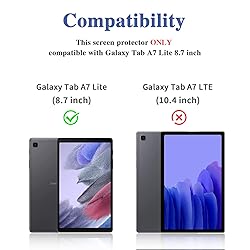 [Compatible Model] Screen protector tempered glass for Samsung Galaxy Tab A7 Lite tablet 8.7 inch 2021(Model: (SM-T220/SM-T225/SM-T227/SM-T225N/SM-T225C ), Not fit for other models. [9H Hardness] 9H hardness tempered glass screen protector is 3 times stronger than other film, offers Maximum protection your tablet from high impact drops and accidental scratch. [High Definition] 99.9% high light transmittance keep the natural viewing experience, oleo-phobic coating layer offers Fingerprint proof and dirt-proof. [High Sensitivity] Only 0.3mm thickness, full compatible with 3D Touch, faster responding and the original touch feeling. [Easy Installation] Bubble-free by installation kit, Clean the screen and press the screen tempered film, the small bubbles left will disappear automatically.