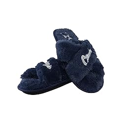 Officially Licensed Slip-on style with open-toe design Textured outsole Script team name embroidery on cross straps Super soft, faux fur material
