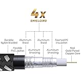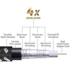 - Quad Shielded And Nylon Braided RG6 Coaxial Cables FEATURES Conductor: Real Gold Plated Copper Core Connector: F-Pin Male to Male 24K Gold Plated Shields: Quad-shielding consists of four layers of aluminum foil and braid shielding against electromagnetic interference (EMI) and radio frequency interference (RFI) Material: High quality PVC Jacket & Durable Nylon Braided Jacket Useful Free Add On With the 90 degree male to female adapter,you can turn the plug from straight into 90° angled, for more convenient inserting as you wish;With the 15pcs cable ties, you can make it easy to secure the cables. Supported Devices: Cable Modems, Televisions, Satellite Receivers, Off Air Antennas - including HD Antennas, on DIRECTV, Satellite Dish, Comcast, Charter, Verizon FiOS, AT&T U-Verse, FTA, OTA, Satellite Internet providers (such as HughesNet, Wild Blue, Excede), Cell phone wireless extenders, and many other services and providers