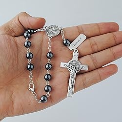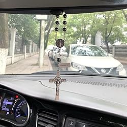 Saint Benedict Car Rosary length is 19.5cm , with Lobster easy to hang on Car or Truck Rearview Mirror. Car Rosary beads made by Black Hematite beads ; The St.Benedict Center piece and Crucifix are Anti-Silver plated, the engrave very details; Each Car rosary pack in black velvet bag, it is also can be pocket rosary bring it at all times; Saint Benedict Evil Protection Medal hang on Car or Truck Rearview Mirror, To bring you safety, happiness, and good fortune.