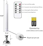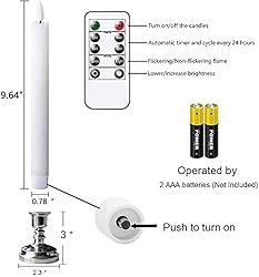 Package List: 6 white flameless taper candles (0.78”D x 9.64”H), 6 silver removable holders, one remote control with 10 different keys. Each LED candle requires 2 AAA batteries to operate. NEW 3D Flameless: These flameless window candles have a 3D flame, the warm LED light is pretty and bright enough.they have a more natural flickering light.look and behave more like real candles, really add to the ambiance of the holiday. 10-KEY REMOTE: The included 10-key remote control allows you turn on/off the candles from a distance, set the 2H/4H/6H//8H timer, change the flickering flame or steady light mode, lower/brighten the brightness, convenient use and easy operation, in this way, you can put the candles anywhere you like. 100% Safe: Flickering flameless taper candles without real fire. There is absolutely no fire or burning danger and it is safe for families with pets or young child, you can have perfect ambient evenings with peace of mind. Satisfaction Guarantee: Each flickering flameless taper candles is thoroughly and rigorously tested. If you are not satisfied, please contact us GenSwin any time, We will offer free replacement