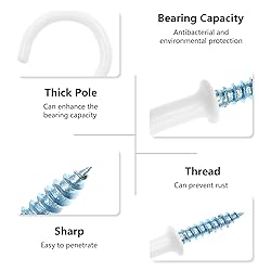 *Package Included: 50 x white ceiling hooks. Screw length is 0.47" / 12mm, Hook length is 7/8" / 22mm. It fulfills your daily needs. *Quality Selection: Made of high-quality steel, the cup screw hook is strong and durable. And it’s coated with vinyl which is soft and smooth, protecting your hands and the item you hanging. *Simple Installation: The screw end design makes it very easy to install, sharp eye point bites into wood easily, and quickly, you can easily screw the metal cup hook into the wood, wall, ceiling. *Wide Application: Perfect for indoor and outside use. This vinyl cup hook set can be used for a hanging mug, towel, plant, pot, light, light fixtures, curtain, ropes, chains, keys, small accessories, wind chime, feeders, festival decoration, and anything you want. *Hassle-Free Guarantee: PHITUODA's products can only be packed and shipped after strict quality inspection. If you are not satisfied within 90-days, send 1 simple email and receive a 100% money-back refund. We're so confident you will love our products like our other 5-star reviewers! You will be amazed at the customer service you receive after the sale!