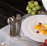 PACKAGE INCLUDES: 160 packs of polished silver extra heavy weight plastic cutlery combo box CREATIVE STYLE: This polished silver cutlery combo box is made with sophistication that is perfect for your table arrangement. GOOD FOR ANY OCCASION: This is suitable for any celebration, gathering, parties, or even usual home dining SATISFYING QUALITY: These are BPA free and made with high quality non-toxic plastic that is perfect to use for foods. QUICK CLEANUP: These are designed with an elegant vibe yet can be easily disposed or recycled for quick party cleanup.