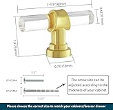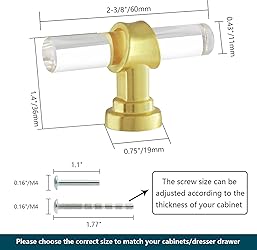 - Cionyce is a company that pursues high-quality products and takes pride in customer satisfaction, and strives to provide the safest, most satisfactory and most convenient shopping experience for our customers. Cionyce 12 Pack Acrylic Kitchen Cabinet Handles Knobs Brushed Brass Drawer Knobs, T Bar Gold Cabinet Pulls for Dresser Drawers Cupboard Wardrobe, 2-3/8" Overall Length Specification Total Length: 2-3/8"/60mm Total Height: 1.4"/36mm Rod Diameter: 0.43"/11mm Base Diameter: 0.75"/19mm High-Quality Material: High-quality acrylic tube & solid zinc alloy base Package Contains 12 x cabinet knobs 12 x M4x1.06" screws 12 x M4x1.85" screws Why Choose Cionyce? Exquisite appearance, exquisite round zinc alloy base shape, thick handle, noble and elegant. Can meet most styles of home decoration, suitable for cabinets, dressers, wardrobes, drawers, closets, desks, etc. It has high transparency, is not easy to oxidize, and is not easy to change color. Even after using for a long time, the handle can be kept as new. Wipe with soft foam can eliminate fingerprints. The maintenance is simple. If there are slight scratches, use toothpaste to wipe it clean. Excellent after-sales guarantee: We provide you with comprehensive after-sales service. No risk. If you have any questions, we will patiently answer them for you. If you are not satisfied with our products, please let us know. We promise to give you 100% satisfactory after-sales service.