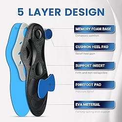 - Caring For Your Feet, relief them from foot pain, more comfortable orthotic Insoles! Why do you have foot pain? Long time standing plantar fasciitis flat feet Hallux valgus Sport injury Fallen arch Heel spur over pronation achilles tendonitis Want orthopedic insoles supportive and cushioning? Firm but flexible 3.5cm arch support relive arch pain. Structured heel cup with built-in gel pad relive heel pain. Large metatarsal gel pad relive forefoot pain. Deep Heel cradle align your body and relive ankle pain and back pain. Dual layer cushion give all day comfort. Ideal for: low Arch, high Arch and neutral arches. Casual, Hiking, Running and Athletic Shoes, Work boots Instruction to use: (1) Remove your original insoles out first. (2) Trim along original insoles or the cutting line. (3) Place the orthotic insoles into the shoes.