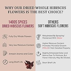 Dried Hibiscus Flowers, Satisfaction Guarantee: If you aren't satisfied with your purchase, just contact us and we'll refund your order in full Your Cooking Secret: Edible dried hibiscus flowers are extensively used in Indian and Mexican cuisine. Impress your guests with the unique aroma of your Indian sauces and marinades. Add 1400S SPICES Hibiscus Flowers to your favorite quesadilla, enchilada or even taco recipe and marvel at the result Healthy And Beneficial: In Ayurveda, dried Hibiscus Flowers have been used for its healing properties for thousands of years, treating emaciation, dysmenorrhea, hair loss and for strengthening the heart muscle. Their beneficial effects on heightened blood pressure are scientifically recognized Also known as Sorrel Leaves and Zobo Leaves