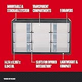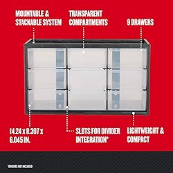 9 large transparent drawers for high content visibility Modular storage: Easily stacks with other organizers to create a custom system Impact-resistant plastic construction Can be wall mounted or stacked Designed for handling small parts and accessories