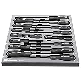 EFFICIENT AND STYLISH: All EVA trays are finished with a brushed aluminum like top layer that adds style and durability to each set. Each tray is clearly marked with the size and type of each tool so you spend less time searching for the right tool and get the job done faster. MAXIMUM COMFORT: Double Injection Soft Grip Trilobular Handles for Maximum Comfort and Grip FINISHED: SVCM (Silicon Vanadium Chromium Magnesium) Alloy Steel Shafts with Sandblasted and Magnetized Tips, Large Size Drivers have Hex Bolsters for Added Torque When Needed CONTAINS: 4 Slotted Screwdrivers, 5 Slotted Screwdrivers with Hex Bolster, 4 Phillips Screwdrivers, 4 Phillips Screwdrivers with Hex Bolster Made in Taiwan