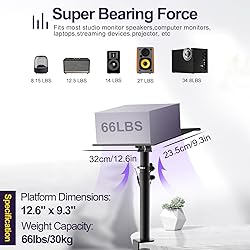 [Solution to expand desk space] This table speaker stand save your valuable space in your studio cause it only take 6.95 sq in surfaces to clamps on your desktop [Adjustable height tilt for perfect listening position] Height adjustable from 13.4’’ to 18.2’’, tray tilt angle adjustable from 0-15°, 360° rotating allow to place the sound towards your ears [Anti-slip & Anti-vibration pads] Soft EVA absorptive sound isolating pad prevents the desk from vibrating and reverberating, while also provide essential gripping for the speakers [Stable 66lbs weight capacity] 12.6”x 9.3” Speaker platform holder can support up to 66lbs, universal table stand for most studio monitor like speaker, home theater system, projector, laptop [Durable aluminum metal stands] Being constructed by diecast aluminium, it is weighted and heavy enough to become stable and durable