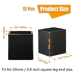 Package Included: 12pcs x Square Leg Cap Covers. NOTE: Please refer to the reminder of the size chart before buying. (Refer the Size Picture). Product Feature: Inner Hole Size: 20 x 20mm / 0.8 x 0.8 inch (L*W), Total Size: 24 x 24 x 24mm / 0.95 x 0.95 x 0.95 inch (L*W*H). Fit for 20mm / 0.8 inch square leg end size. Premium Material: 0.8inch Square black chair Leg end caps cover are made of high quality soft and durable PVC material water, rust and dust-resistant. If the leg caps are hard to fit it, please soaking for a few seconds in warm water to soften them for snugly fit. Application: Square chair leg caps are snug fit to stay in place of the chair feet and quietly along any floor to prevent scratches and noises, waterproof, rust-proof. The square chair leg floor protectors are suitable for metal chair leg caps, folding chair feet, outside chair leg caps patio furniture. Floor Protector: Easy to install and push the chair leg feet on, it fits snugly and works well for hardwood floors. Chair leg caps for metal chair leg, folding chair feet, outside patio furniture.