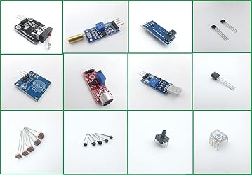 - KIT CONTENTS: 1* MQ-3 Alcohol sensor; 1* ACS7112 current sensor ±5A; 1* MQ-5 LPG/NG sensor; 1* Mini PIR module - 1* OPT101 Light sensor; 1* HR-202 relative humidity sensor; 1* 40kPa MEMS Pressure transducer; 1* Inductive current sensor 5A/5mA - 2* LM35 Temperature sensor; 1* Switch module (crash sensor); 1* WYC-H206 Photo interrupter sensor; 2* AH49E magnetic field Hall effect sensor - 1* High gain microphone sensor; 1* Load cell 50kg; 1* Vibration/tilt detector; 1* Touch sensor module; 1* Optical obstacle detection (adjustable range) - 5* 100KOhm NTC Thermistor; 5* 100KOhm Photoresistor; 1* IR Phototransistor + IR LED; 1* Plastic enclosure 5x3 ways - KIT with sensors to measure or detect: Alcohol, Electric Current, LPG/CNG, Presence, Light, Relative Humidity, Pressure, Temperature, Crash, Motor speed, Magnetic field, Sound, Weight, Vibration/tilt, Touch, Obstacle detection, Fire/Flame