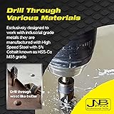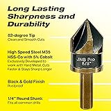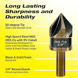 - Elevate your precision in both metal and woodworking projects with countersink drill bit set steel. JNB Pro countersink drill bit set for metal quality countersink bit set is made from High Speed Steel with Cobalt (HSS-Co M35 grade), providing durability and resistance against wear & corrosion. Handles varierty of material, these are countersink drill bit set for stainless steel that brings professional results with tough industrial metals or detailing wood finishes. These bit countersinks (82 degree countersink) are with 5 flutes for smoother drilling. Available in sizes 3/4", 3/8", 1/2", 5/8", and 1/4" 82° countersink 1/4" shank, these chamfer drill bits / chamfer bit for steel/ cobalt chamfer bit is versatile for fastening tasks—from light decorative work to heavy-duty construction. Bits for drills works both with stationary & handheld - fits standard drills. It's a precise countersinking drill bits for metal that provides a professional level finish in every project. This counter sinker drill bit is equally useful in woodworking, providing clean, sharp & efficient cuts.Known to Spanish builders as puntas avallenadoras para metal, herramientas de carpintería, brocas para metal, broca para madera, juego de brocas para metal, herramientas de carpinteria, herramienta para carpintería, cortador de madera, carpinteria accesorios, herramientas para madera, herramientas para carpintería de madera, brocas avellanadores para madera & avellanador para madera. This metal countersink bit for steel cobalt are for those who demands reliability and precision, this countersink drill bit set for metal offers the ideal solution. Ideal for craftsmen and DIY enthusiasts who demand the best in tool performance and versatility.