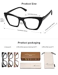 Blue light blocker&UV400 Lenses LENS FUNCTION:Reduce eyestrain, anti blue ray to a great extent.Enjoy your digital time,NO worry about eye fatigue, blurred vision and headache,let you have a better sleep STYLE FEATURE:This glasses makes a trendy horn shape look modern with its sharp angles and carved face front,the thick plastic surrounds square lenses for a striking, yet sophisticated look.Style these specs with just about anything for some everyday glam. PRODUCT DIMENSION – Lens Width: 52mm(2.04inches) | Lens Height: 43mm(1.69inches) | Temple Length: 145mm(5.70inches) | Nose Bridge: 19mm(0.75inches). GIFT IDEAS PACKAGE – Glasses*3,microfiber pouch*1, microfiber glasses cleaning cloth*1. It is also a gift packaged ready, making it a wonderful yet practical gift idea for friends and family!