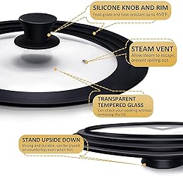 Multi Purpose & Sapce saving Lid: Ydeapi universal lid is specially designed to perfectly fit most pots and pans with diameter 7" to 12". A must-have cookware in your kitchen. Just use two lid to cover your pots, pans, skillets, fry pans, saucepans, stock pots and woks, so you can keep your kitchen tidy and no longer cluttered. High Quality Glass & Food Grade Silicone: Ydeapi pot lid is made of premium tempered glass and food grade silicone. Safer, stronger than normal glass and no metal rusting. The silicone outer ring and anti-slip knob are heat-resistant up to 450°F. Easy To View & Steam Vent Design: The transparent glass allows you to directly monitor the cooking progress without removing the skillet lid. The steam vent hole is designed to release excess moisture and pressure and prevent spillover, while minimizing loss of moisture. Dishwasher Safe & Easy To Store: Save your time to clean the pan lid by placing it in the dishwasher. Also easy to clean by rinse the frying pan lid under running water. The flat design of lid saves more storage space.