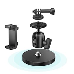 - 【Product Name】JEBUTU Magnetic Camera Mount 1/4 Screw with 360° Swivel Tripod Ball Head & Action Camera Adapter & Phone Holder for GoPro Insta360 Akaso DJI Action, Magnet for Car, Attaches to Steel or Other Magnetic Surfaces 【Product Details】 💡💡This magnetic mounting base features strong magnet with compact 65mm / 2.6"" diameter and has a super strong magnetic strength.The magnets on this mounting base are covered with rubber coating, so it won't damage or scratch the mounting surface, also protect your devices from slipping and shifting. 💡💡Both the magnetic mount and ball head have a standard 1/4"" screw compatible with action cameras, DSLR camera, LED video light and more devices with a 1/4"" screw hole. 💡💡The mini ball head is 360° rotatable and the rotary angle is controlled by the rotary knob. The ball platform also 135° tiltable. This mini ball head can meet the needs of different shooting angles. 💡💡The weight capacity varies depending on the type of mounting surface. Always test the mount's ability to securely hold your device before use. 【Package Content】 1 x Magnetic Base, 1 x Ball Head, 1 x Cell Phone Holder, 1 x Action Camera Mount"