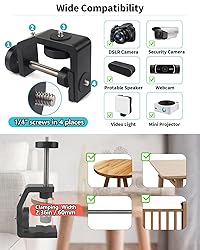 Adjustable Universal C-Clamp: The clamping width of camera mounts & clamps can be adjusted to 2.36"/60mm by adjusting the T-Shape Knob. Super clamp can be firmly fixed to desk,cart,bench,worktable,post,headrest,tabletop,chair,pipe,pole,light stand,heavy duty tripod,etc Flexible Angle Adjustable Ball Head: 1)360°swivel detachable tripod ball head mount ensures 360 degree horizontal rotating and -90°/+45° front tilt for multi-angle shooting. 2)Only by rotating the knob can be adjusted to the desired angle to meet your needs without removing the devices More Stable & Heavy Duty: 1)C-Clamp With 1/4 Screw and the ball head is made of aluminum alloy, anodized treatment with a glossy surface, sturdy and corrosion-resistant. Max Load: 6.6 lb/3 KG.2)JEBUTU Super Clamp Ball Head Mount is designed with protective dense non-slip rubber pads to reduce scratches and improve the overall stability Wide Compatibility: 1)Multiple 1/4 Screws: C-clamp camera mount clamp is designed with 4 x 1/4" screw in different directions, and the ball head also has a standard 1/4 screw, so the equipment can be set in different places according to your shooting needs. Standard 1/4" screw suitable for Dslr camera, video light, security camera, Webcam, Monitor etc. 2)1/4 screw hole: Ball head has a 1/4 screw hole on the bottom, can be directly mounted on the C-clamp, tripod /light stand/monopod/desktop mount stand /webcam stand Package Contents & Note for Use: 1)The Package includes: 1x C-Clamp, 1x tripod ball head mount 2)The installation of the product is easy and simple, you can refer to the instruction on the picture. If there are any questions, please feel free to contact us