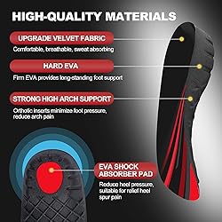 - RooRuns-We are a company with many years of professional experience in the design, development and manufacture of orthotic insoles, and it is our ultimate goal to provide you with the best quality products and services. If there is any dissatisfaction with our insoles, contact us promptly and any customer concerns will be resolved within 24 hours!New Upgraded InsolesCompared to other arch support insoles:(1)This insole is more stable,provides enough support even if you weigh more than 330 lbs.(2)There is an additional red pad under the orthotic insole to provide extra cushioning and shock absorption. (3)Non-slip striping on the bottom of the heel cup for great stability and no slipping.Suitable for everyday wear and even sports,provide you with enough support, but also with a slight heightening effect, so that you are comfortable and confident.Gift for Parents and Family!Ideal for :flat feetsore feetheel painheel spurplantar fasciitisflat feetarch painover-pronationfallen archmetatarsalgiashin splints bunions morton's neuroma