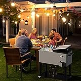 - Make outdoor entertaining a breeze with our rolling ice chest cooler cart. Our cooler, crafted with high-quality iron spray material and a PP-lined injection-foam-unitized interior, is stable, sturdy, and durable. This large cooler features 2 locking casters and 2 non-locking casters, allowing it to stop securely at any time. Solid metal handles make it easy to push or pull the cooler. The cooling function cool preservation for up to 48 hours with ice sheet. If keep warm, it can hold 8 hours. With a capacity to hold up to 100 cans or 55 bottles, this cooler is the perfect companion for keeping your drinks cold and conveniently transported. It is ideal for hosting large parties and outdoor or indoor activities such as dinner parties, BBQs, or pool parties. Additionally, it features a bottom shelf for extra storage.