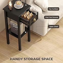 Slim Design for Small Spaces: Only 11.75" wide, this narrow end table slides easily next to sofas, beds, or into tight corners—great for small apartments, dorm rooms, or anywhere space feels limited Enough Storage Where You Need It: A smooth slide-out drawer keeps remotes, glasses, or small essentials tucked away, while the lower shelf is great for books, magazines, or decor you want close at hand Stylish & Multi-Purpose Use: Clean lines and a simple look let this table work as a sofa side table, coffee corner stand, hallway display table, or even a small plant stand—easy to mix into any room Stable, Safe & Well-Made: The accent table is built from reliable MDF with a 33 lbs. tabletop capacity, plus an anti-tipping strap for extra safety. The raised base helps keep stored items away from floor moisture Side Table Info: Overall Dimensions: 11.75" L x 11.75" W x 29.5" H; Drawer Inner Size: 7.25" W x 9.25" D x 3.25" H; Weight Capacity: 33 lbs.