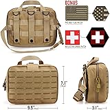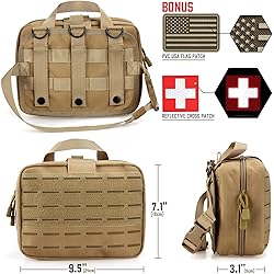 - Flexibility for Molle System and HeadrestStrong Molle webbing on the rear, deadly hard wearing & heavy duty. Universal panel attaches to ANY vehicle headrestMolle attachment straps to be worn on a belt, vest or military backpack, tactical platform, or put in your car as a car first aid kit bag. Free Patch IncludedReflective white medical cross identification patch and the PVC Flag patch are included.The patch makes the pouch more conspicuous, fashionable, eye-attracting when under a flashlight in the dark! Tri-Fold DesignTactical EMT pouch with the tri-fold design internally has spacious compartments which include several pockets, strong elastic loops, and instrument holders. Aways Quick Access With Full OpenMolle EMT pouch closed by double zippers with pulls, allowing you to open up completely to the bottom.Wide handle for carrying or rapid removal. Two D-rings on the back for the shoulder strap. Function for Everyone & ActivitiesTactical EMT pouch is the standard used by military personnel, police, EMT, firemen, and by responsible civilians as an easily accessible and necessary component for first aid needs.Also for outdoor activities such as camping, hiking, backpacking, adventure, cycling. You can carry first aid supplies to treat bites, wounds, and any other injuries fast and at a moment's notice. Specification:Pouch Size: 9.5"L x 7.1"H x 3.1"D (24 x 18 x 8 cm)Material: High-density 1000D PolyesterCA Flag Patch: 3"L x 2"W (7.5 x 54 cm)Red Cross Patch: 2" x 2" (5 x 5 cm)Zipper: Duanl-way double zipperItem Weight: 600g/1.32lbs Product Include:1 * Cross Patch1 * Canada Flag PVC Patch1 * Tactical Large EMT Molle Pouch