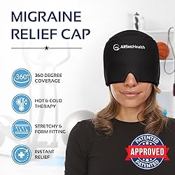 - At last – a natural drug free way to alleviate pounding headaches! Our migraine ice head wrap provides an instant cooling sensation and soothing relief upon contact. Add to your therapeutic toolkit and be fully prepared for the next migraine attack with the All Sett Health migraine relief cap. PRODUCT FEATURES: One Size Fits Most Soft Flexible Fit Single Piece 360 Degree Coverage Freeze and Wear Hot or Cold Therapy 360 DEGREES OF COOLING COVERAGE The migraine hat offers positive compression and cold pressure to alleviate pounding headaches and debilitating migraine symptoms. Single-piece design completely wraps your head in 360 degrees of chilly coverage. It covers the forehead and temples for tension and migraine headache relief, as well as covering the eyes to relieve facial tension and puffiness. SUPERIOR TO OTHER HEADACHE CAPS Unlike other lumpy headache caps, this one is comfortable, smooth and soft with no unnecessary pressure applied. It easily slides on and off without the frustrating hard inserts to deal with. Stretchable one-size-fits-most design can provide both hot and cold therapy and avoids cold ears while you recover. Black form-fitting material is better at blocking out light. Perfect for ponytails or hair down. SOOTHING BLACKOUT EYE RELIEF The migraine hat includes a built-in eye mask to darken the room and apply cooling relief that helps alleviate sinus headaches, eye pressure and puffy eyes. Our migraine hats directly target areas on the head with painfully dilated blood vessels. You can comfortably fall asleep while wearing it.