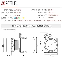 GET NEW ONE IF NOT MAN MADE BROKEN IN 3 YEARS SINCE YOU PURCHASE THE SWITCH. Brand New 22mm Flat Round 110V-120V AC Green LED Push Button Switch Contact Type : 1NO 1NC (DPST) ; Action Type : Latching; Ith : 10A;Ui : 440V Terminal Quantity : 6;Panel Cutout Diameter : 22mm / 0.87";Fit Panel Max. Thickness : 5mm / 0.2"; Button Diameter : 24mm/ 0.94";Total Size(Approx) : 41x 30x 82mm/ 1.6" x 1.2" x 3.2" (L*W*H); External Material : Plastic, Metal Aluminium Alloy Head, For long work life.